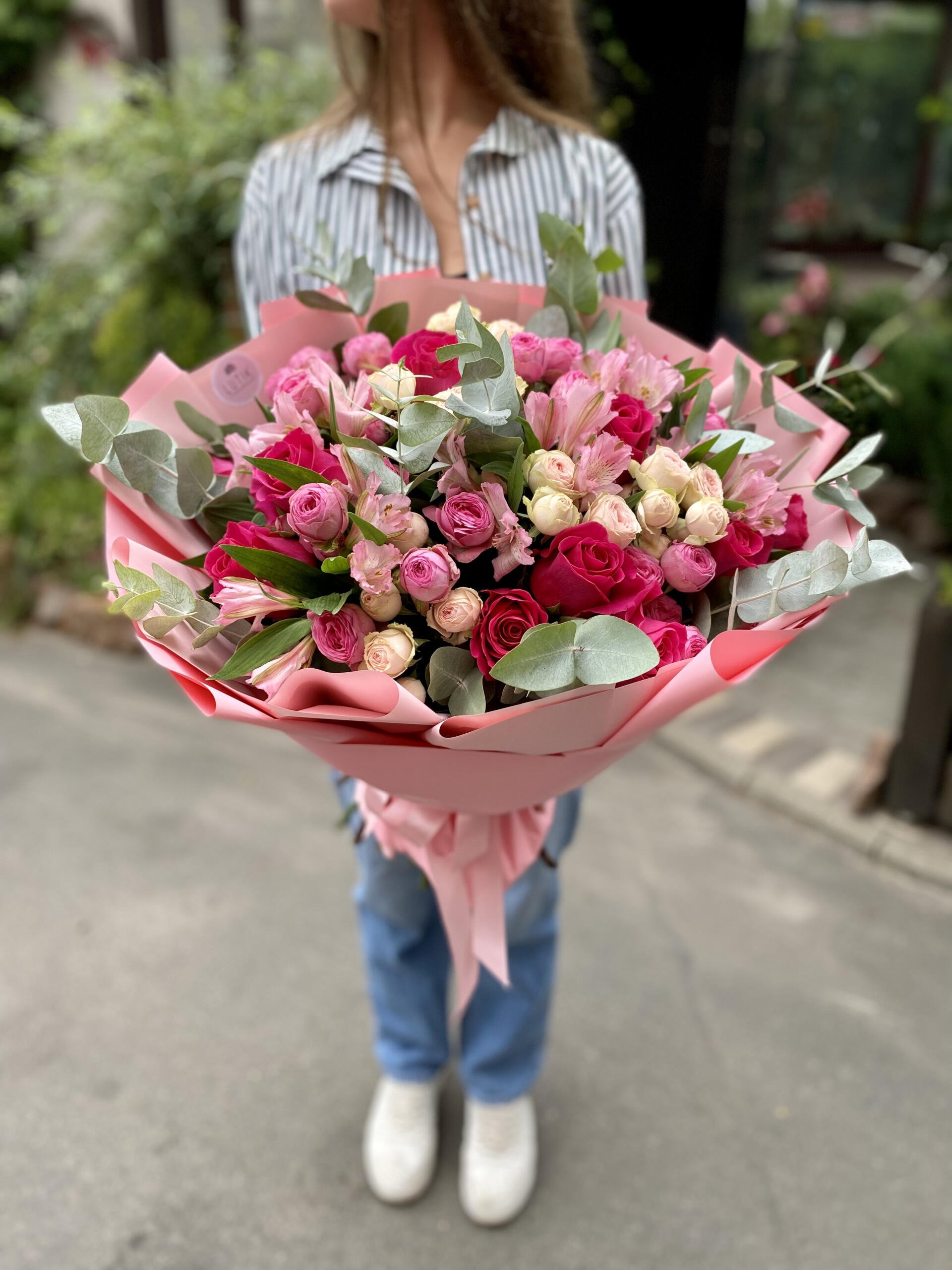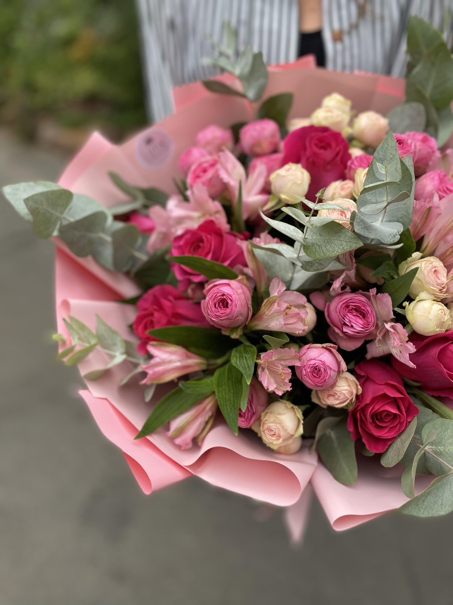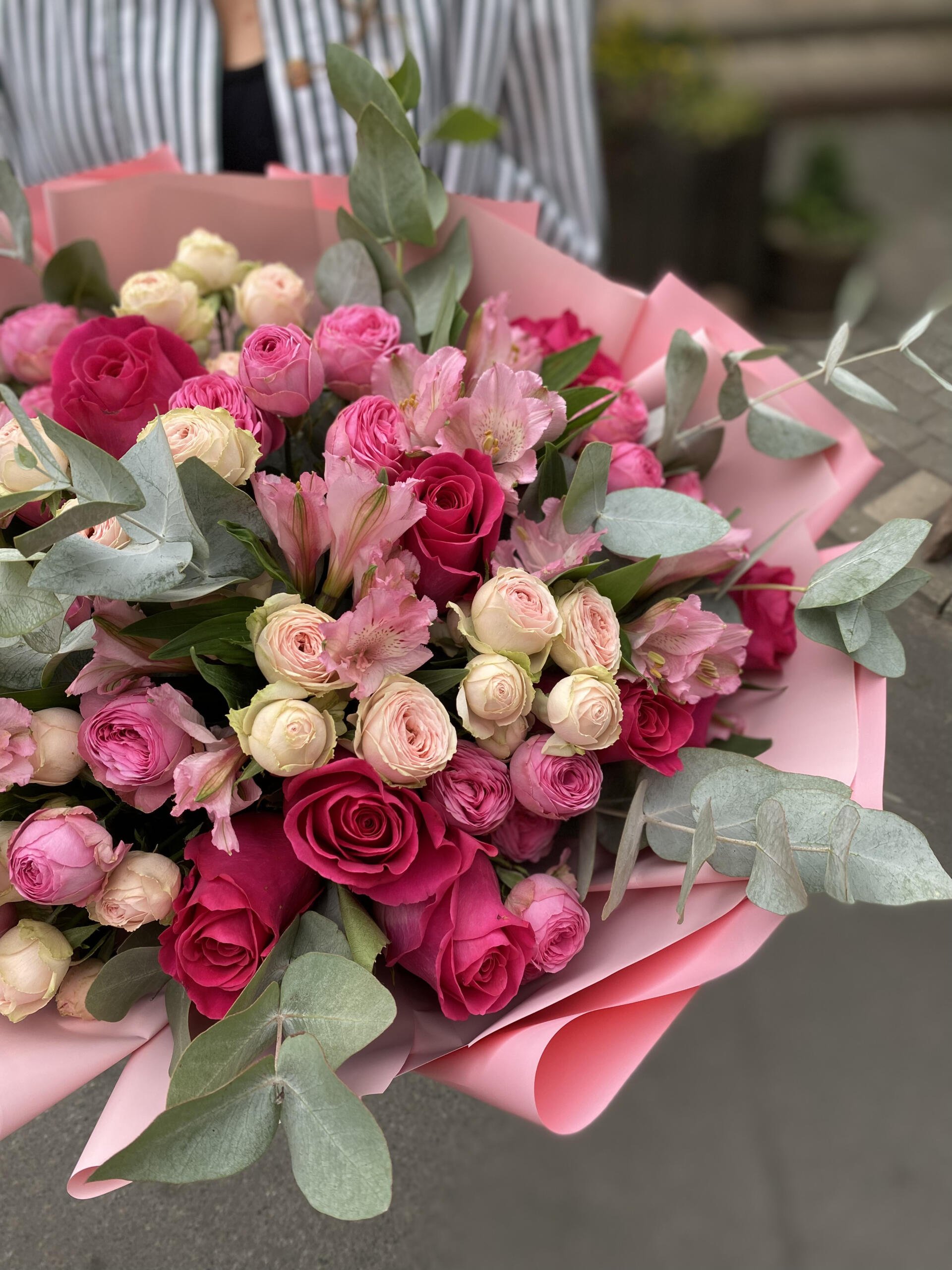 Мы с гордостью представляем вам уникальный авторский букет, в котором совершенство кустовой пионовидной розы, изящество розы и свежесть эвкалипта сливаются в одно великолепное цветочное произведение.