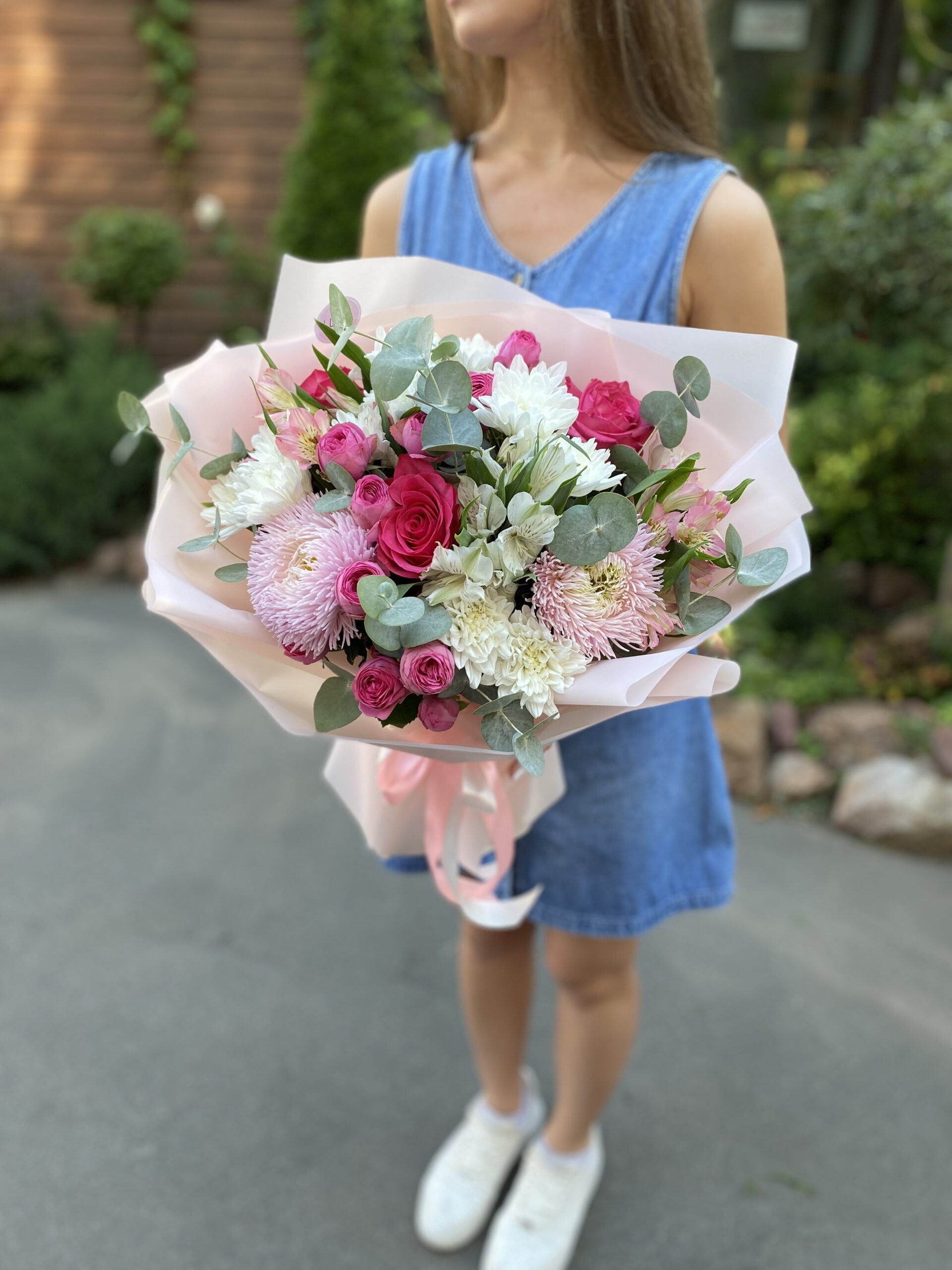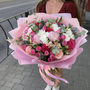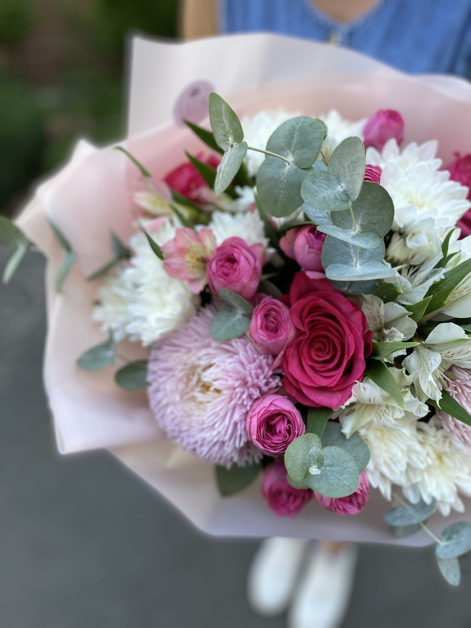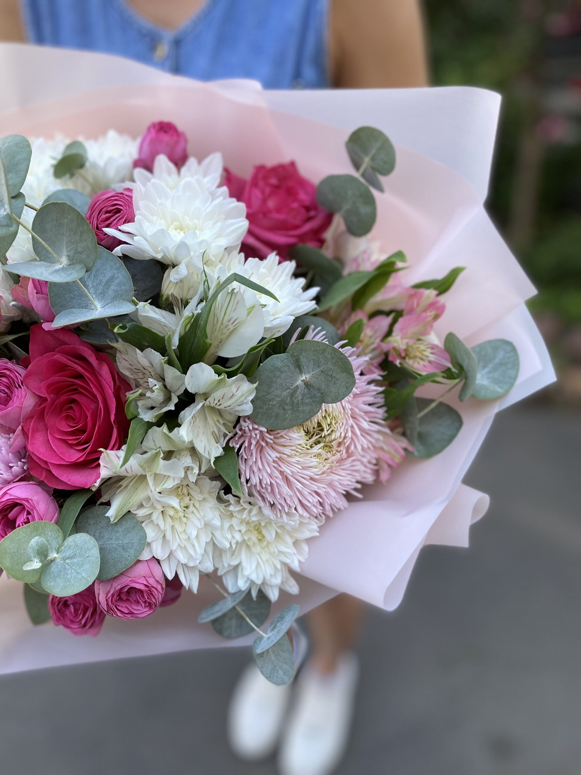 Мы с гордостью представляем вам уникальный авторский букет, в котором совершенство кустовой пионовидной розы, изящество розы и свежесть эвкалипта сливаются в одно великолепное цветочное произведение.