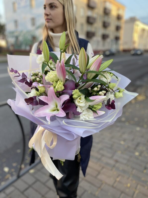 Великолепие и изящество воплощены в авторском букете, созданном мастерами цветочной студии флористики “Лютик” в Гомеле. Этот букет, как чарующий танец весеннего бриза, сочетает в себе нежность и элегантность.
