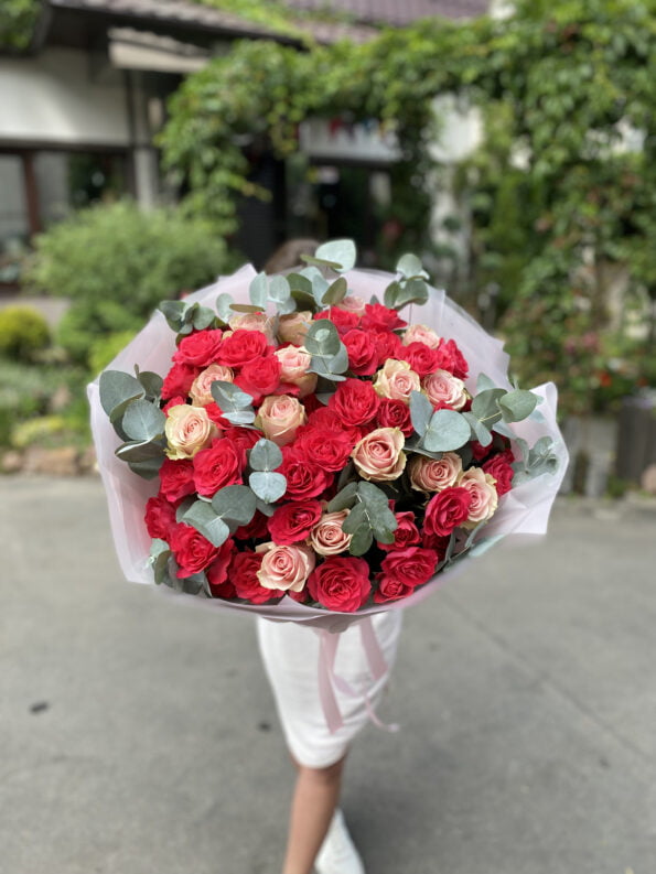 Встречайте волшебство природы в наших сборных букетах цветов, созданных с любовью и искусством! Наш букет, состоящий из нежных роз, величественных кустовых роз и элегантного эвкалипта, одновременно восхищает и пленяет сердца.