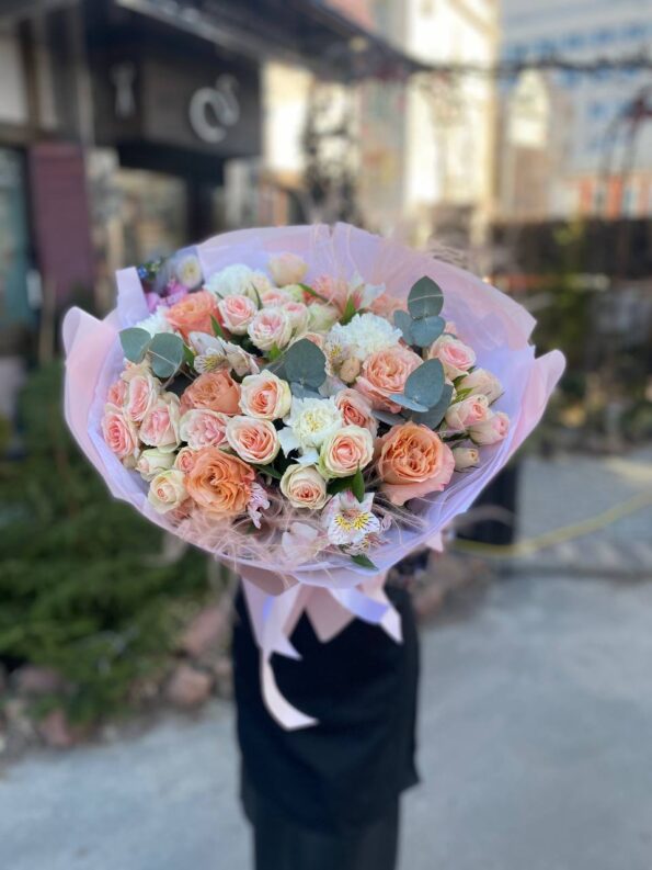 Кустовые розы, с их изящными бутонами, придают букету грацию и элегантность. Одноголовые розы добавляют роскоши и притягательности, своими насыщенными персиковыми оттенками. Диантусы, с их яркими окрасками и нежным ароматом, подарят букету изысканность и свежесть. Альстромерии, с их изящными цветами в виде звезд, придают композиции легкость и воздушность. Воздушная стифа, с ее пышными перьями, создает эффект легкости и игривости, добавляя особую нотку великолепия.