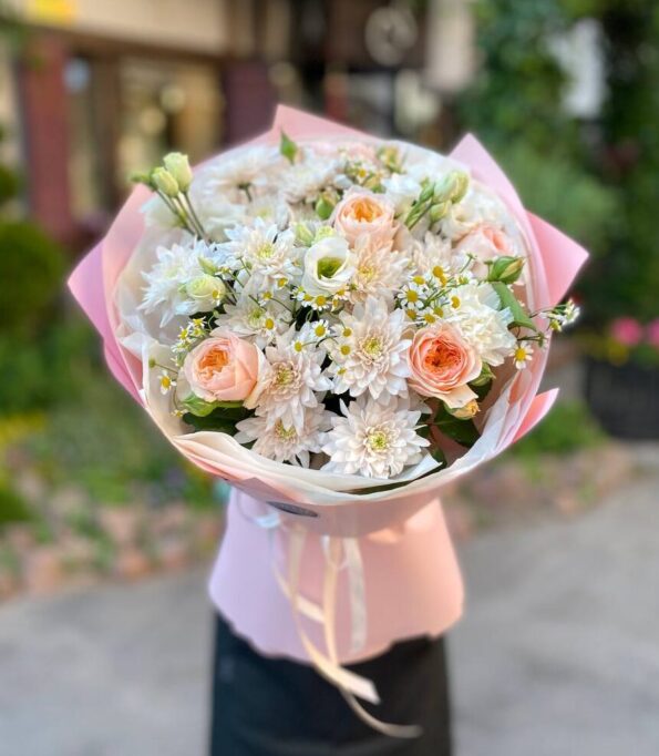 Хризантемы, с их многообразием форм и оттенков, придают этому букету изысканность и изящество. Их мягкие и пышные цветы словно расцветают в объятиях друг друга, создавая гармоничное сочетание разнообразных цветов – от нежного розового до яркого оранжевого. Хризантемы придают букету воздушность и легкость, словно лепестки плавно падают на землю, создавая ковер из цветов.