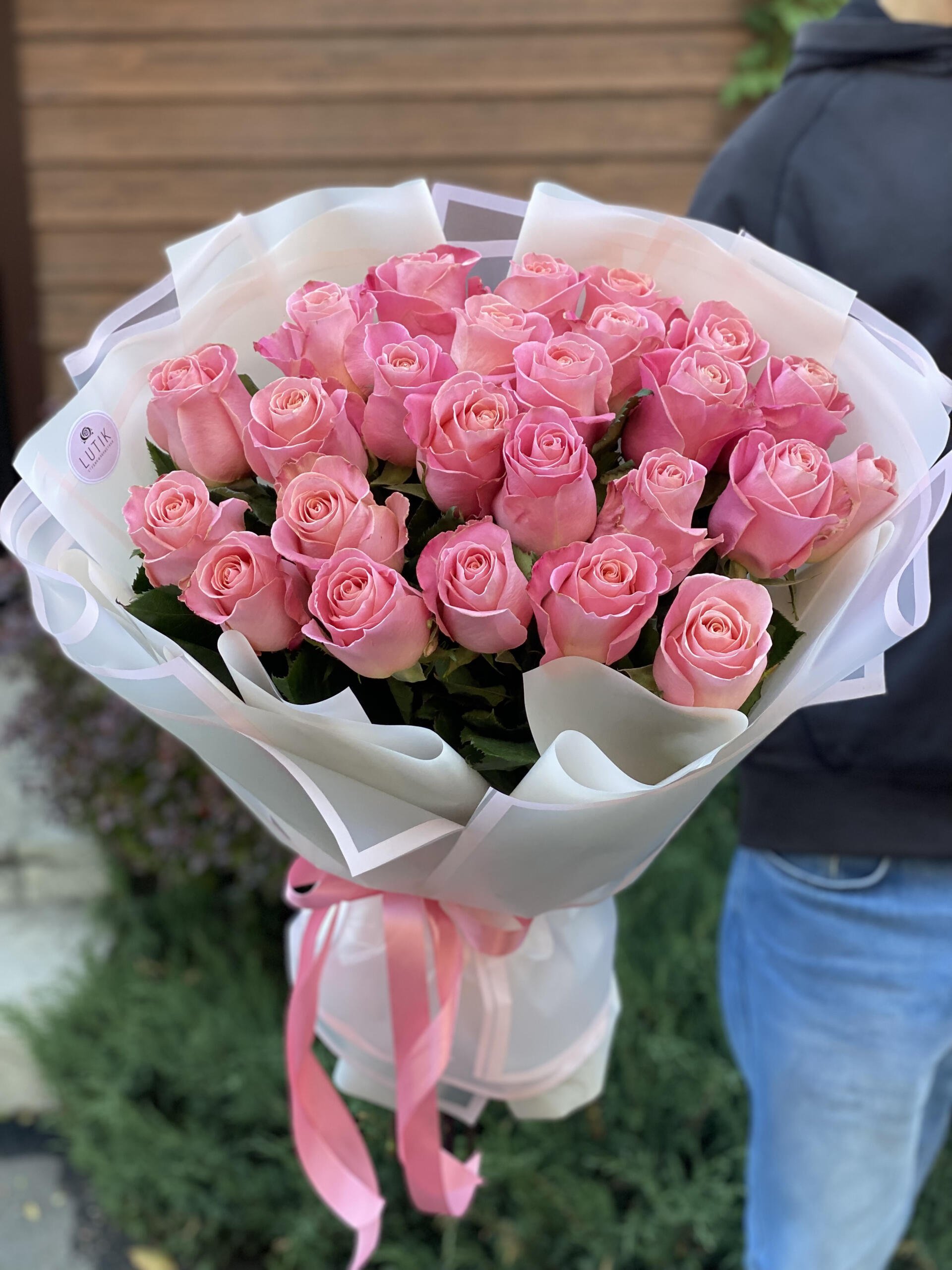 Свежие цветы от Lutik доставляются в фирменной упаковке, которую необходимо снять при установке в вазу. Не срезайте ленту, связывающую букет для сохранения формы.
