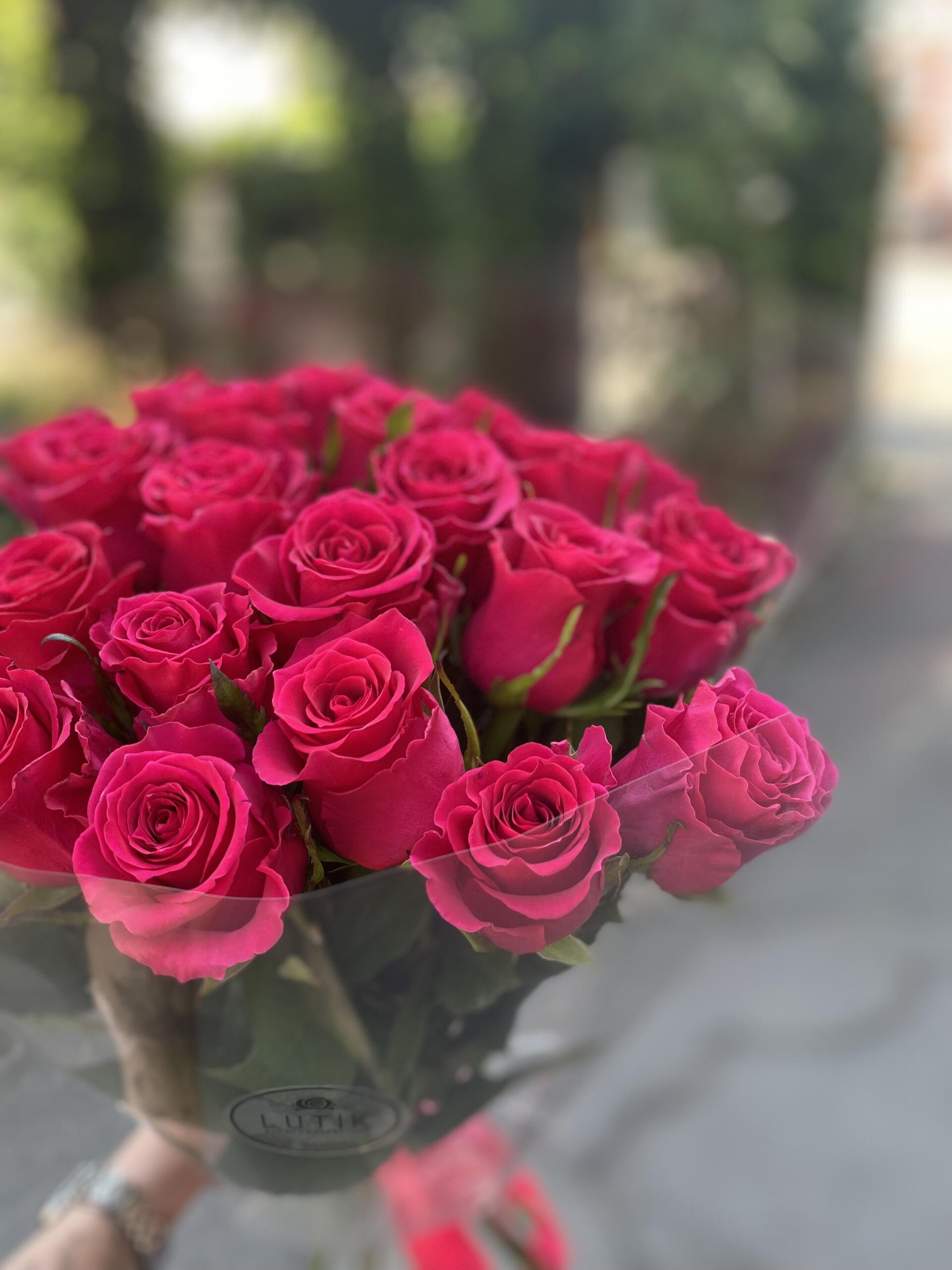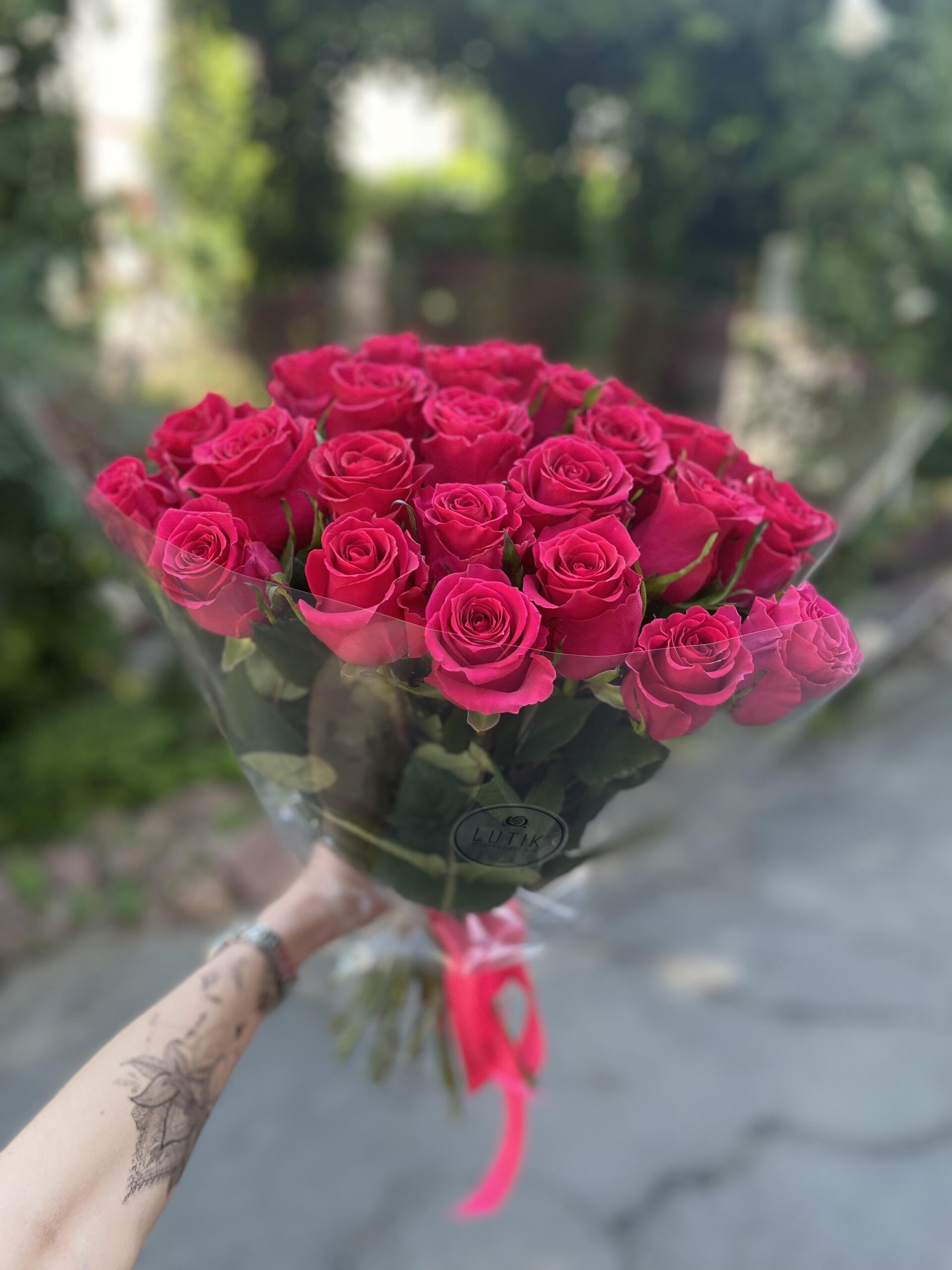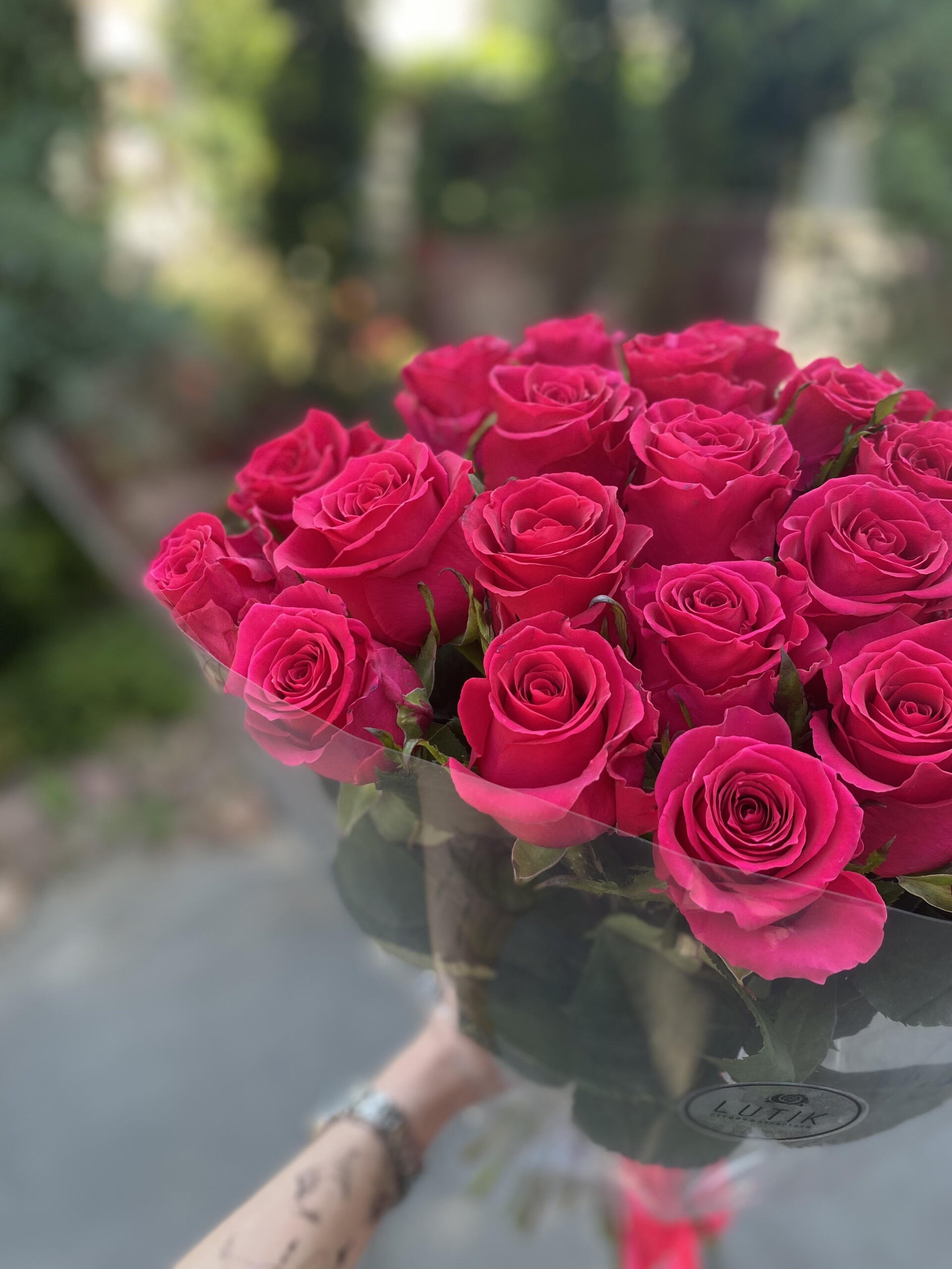 Свежие цветы от Lutik доставляются в фирменной упаковке, которую необходимо снять при установке в вазу. Не срезайте ленту, связывающую букет для сохранения формы.
