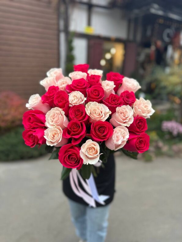 Великолепный букет, созданный с любовью и мастерством в цветочной студии флористики “Лютик”, словно откровение из сказочного сада. Он собран из 33 изысканных эквадорских роз, каждая из которых излучает свою уникальную элегантность и нежность.