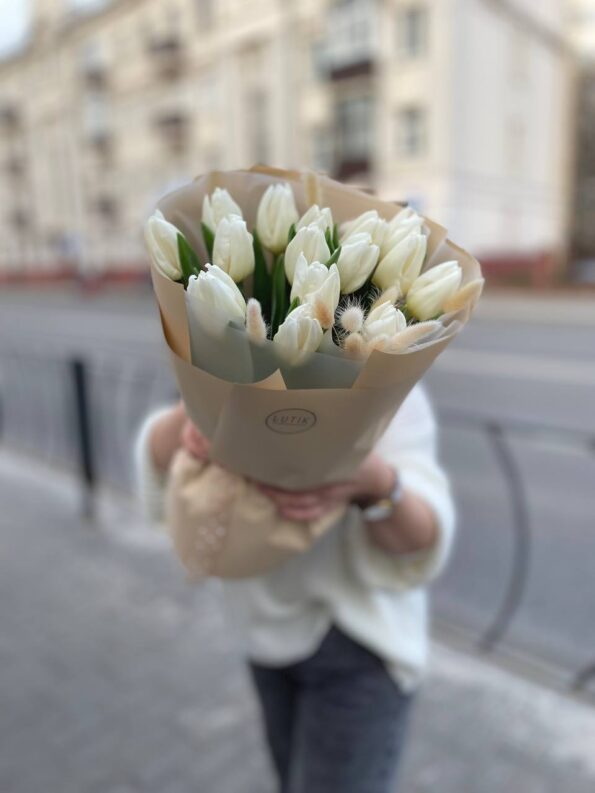 Букет из 15 тюльпанов и лагуруса